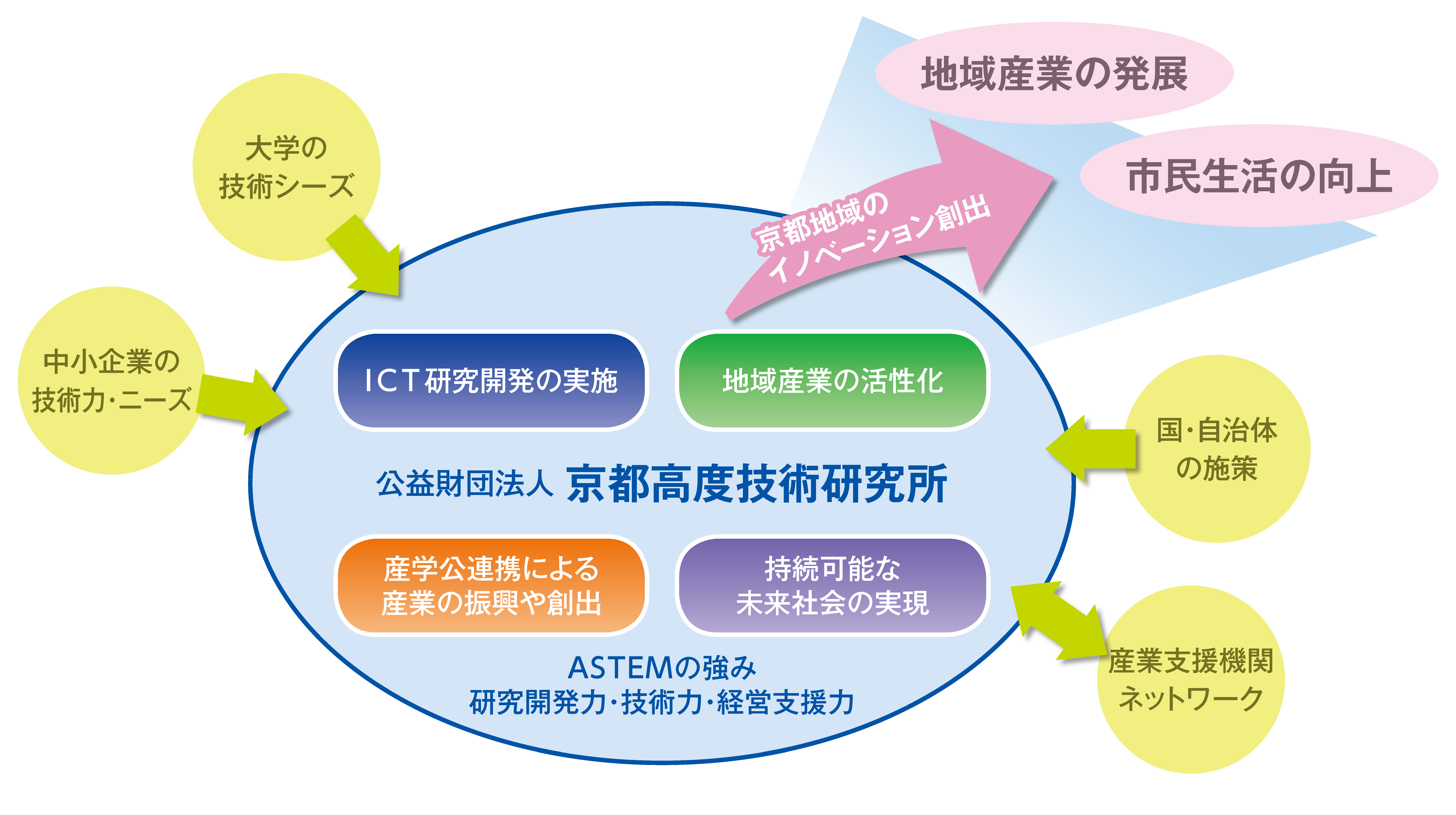 公益財団法人京都高度技術研究所(ASTEM)は、1988(昭和63)年にICT(情報通信技術)とメカトロニクスを活用した先端科学技術の振興と地域社会の発展に寄与することを目的に、京都市・京都府・産業界からの出捐により設立されました。