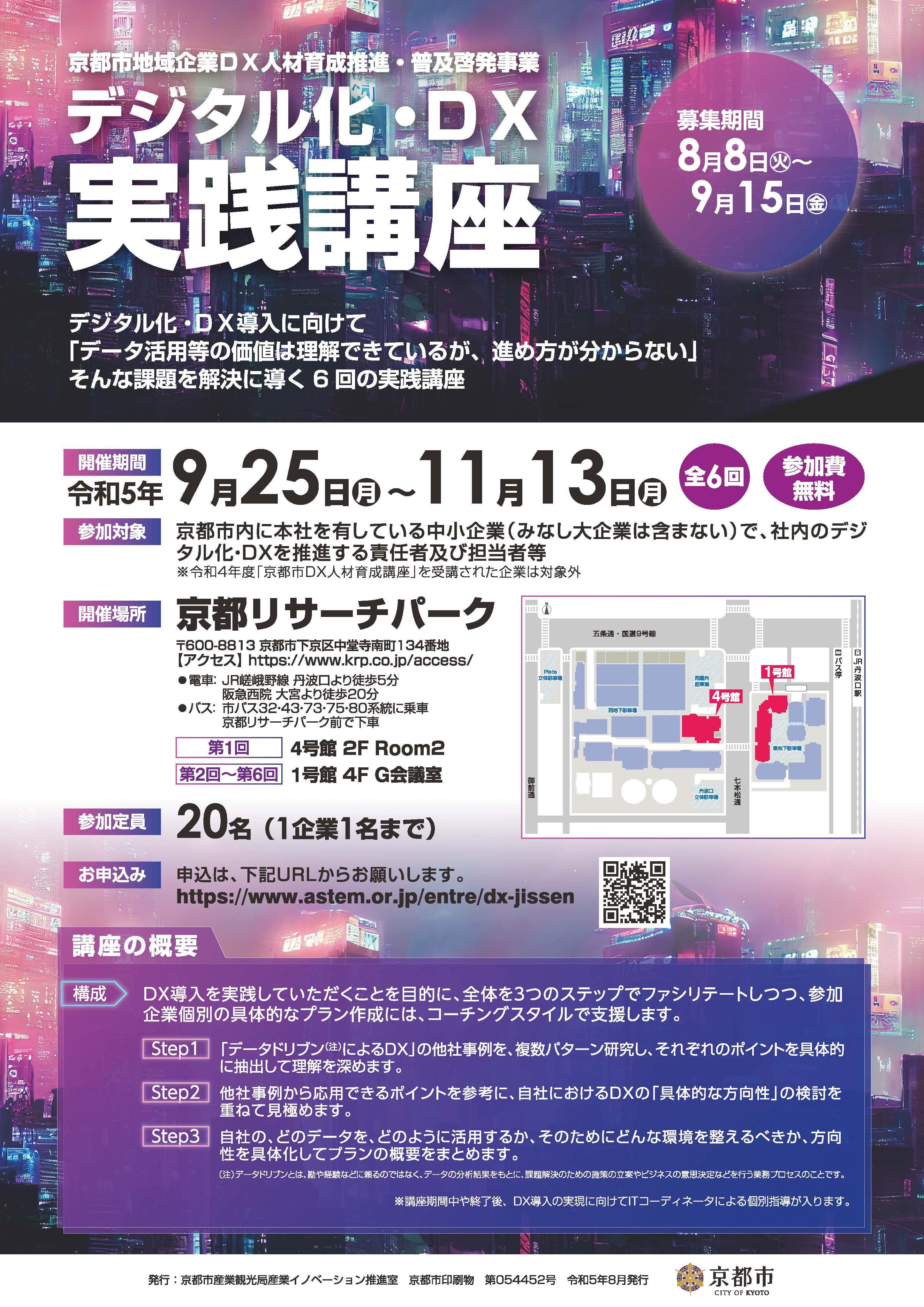 | 中小企業等の持続可能な経営に向けた生産性の向上やビジネスの拡大には、デジタル技術の活用が不可欠であり、新たなビジネスモデルを創出するDX(デジタルトランスフォーメーション)に取り組むことが重要です。 br> この度、京都市では、中小企業等が社内のデジタル化・DXの推進に必要な考え方を学び、社内体制の構築を目指す「デジタル化・DX実践講座」を実施します。 br> 本講座では、ワークショップ形式で学び、最終的に自社の「DXプラン」の策定までを行いますので、社内DXの推進にご活用ください。 br> ※広報資料ダウンロード br> ※チラシダウンロード br> |