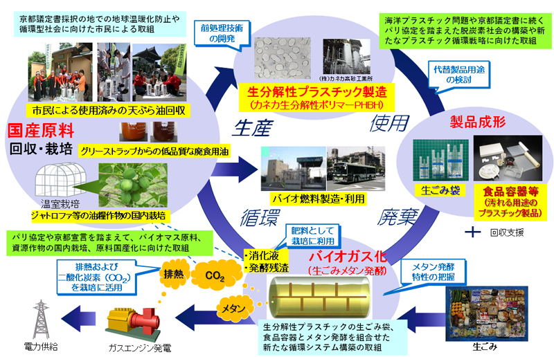 また、生分解性プラスチック原料を中長期的に確保するために、市民による廃食用油の回収率の更なる向上に向けた取組に加え、廃食用油以外の油脂源としてジャトロファ等の油脂作物の国内栽培やグリーストラップ由来の油脂などの活用も検討しています。さらに生ごみ袋以外にも汚れる用途の食品容器などのプラスチック製品への利用拡大に向けた検討も進めています。こうした技術実証とともに、成果を広く市民や事業者に情報発信することで、新たな循環システムの社会実装に取り組むものです。