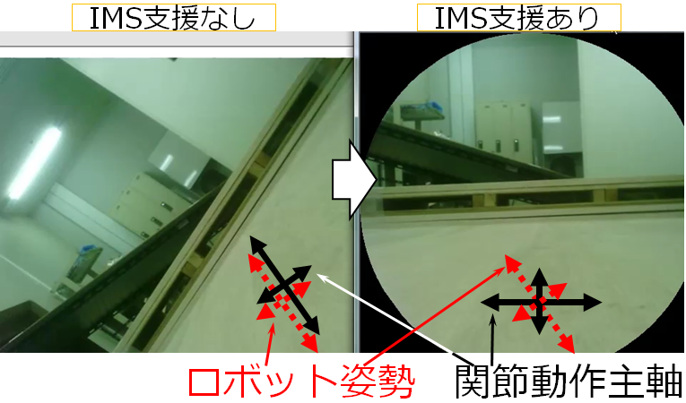 IMSを用いた補正後の映像 (図中右半分) は円形窓を通して表示し、原映像の回転する矩形枠による映像注視・理解時の違和感ないし負担を回避するようにしている。