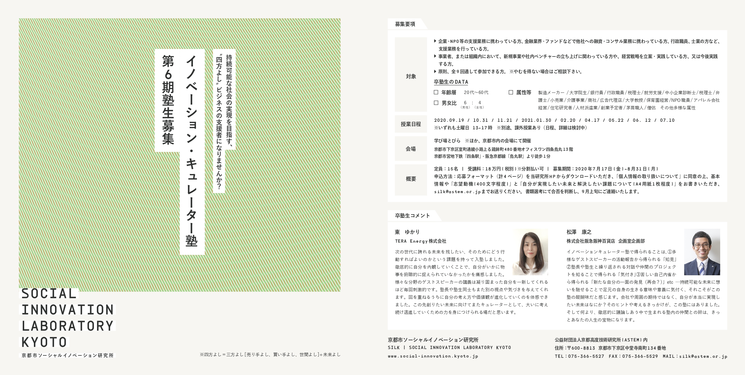 京都市ソーシャルイノベーション研究所では、今年も社会的な課題をビジネスの手法で解決し、持続可能な社会づくりを目指す「イノベーション・キュレーター」を養成する塾を開講します。